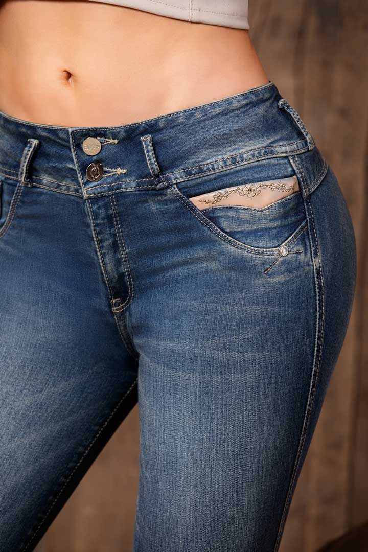Jeans tiro medio con pretinas que moldean tu cintura, Skinny fit, bota tubo y corte colombiano, diseñado específicamente para cuerpos latinos, Pinzas anatómicas y tecnología push-up que realzan naturalmente tus curvas.